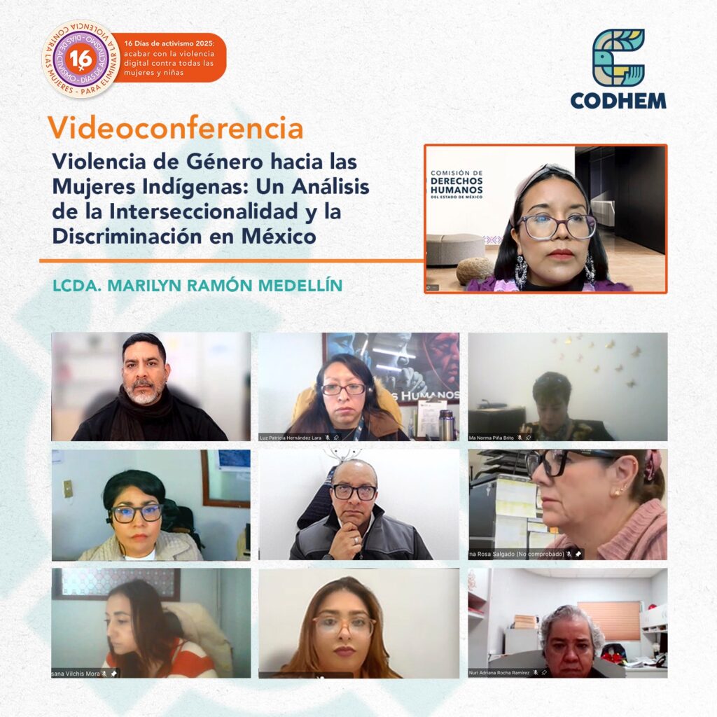 Con el propósito de visibilizar las condiciones que limitan el pleno ejercicio de los derechos humanos de las mujeres indígenas y de exponer las diversas manifestaciones de violencia que históricamente han enfrentado, la Comisión de Derechos Humanos del Estado de México (CODHEM) realizó la videoconferencia “Violencia de Género hacia las Mujeres Indígenas: Análisis de la Interseccionalidad y la Discriminación en México”, a cargo de Marilyn Ramón Medellín, jefa del Departamento de Atención a Pueblos Originarios.