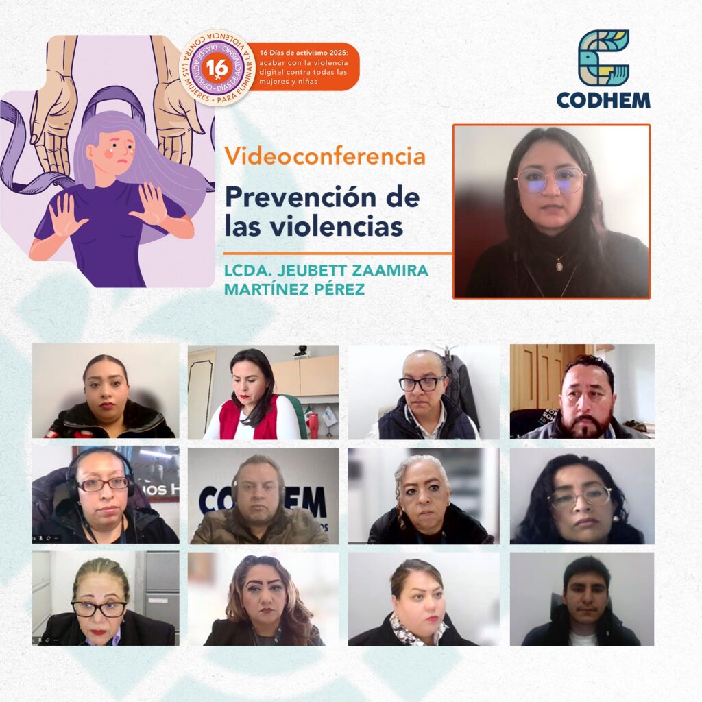 Con el objetivo de identificar factores de riesgo psicosocial con énfasis en la prevención de las violencias de género y construir relaciones igualitarias en el entorno de trabajo, la Comisión de Derechos Humanos del Estado de México (CODHEM) presentó la videoconferencia “Prevención de las Violencias”, a cargo de Jeubett Zaamira Martínez Pérez, de la Subdirección de Transversalización de Género de la Secretaría estatal de las Mujeres.
