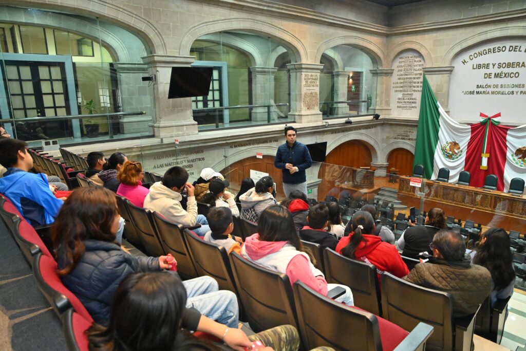 Durante el recorrido, las y los alumnos conocieron los espacios donde se desarrolla la labor legislativa, entre ellos el Salón de Sesiones ‘José María Morelos y Pavón’, del recinto oficial del Poder Legislativo mexiquense, donde se llevan a cabo las sesiones parlamentarias.