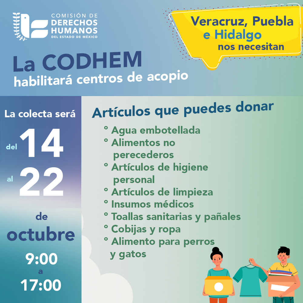 Con el objetivo de brindar auxilio a las personas que han visto afectado su patrimonio y su vida por las intensas lluvias en los estados de Veracruz, Puebla e Hidalgo, el Presidente de la Comisión de Derechos Humanos del Estado de México (CODHEM), Víctor Leopoldo Delgado Pérez, hizo un atento llamado a la solidaridad de la población mexiquense para participar en la colecta de víveres e insumos que realiza el organismo defensor, a partir del martes 14 y hasta el miércoles 22 de octubre, de 9 a 17 horas.
