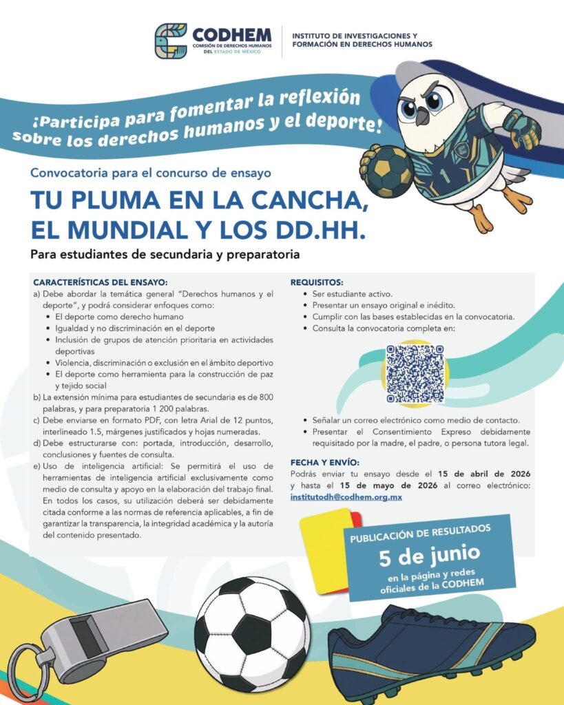 Con el propósito de fomentar la reflexión crítica de las juventudes sobre los derechos humanos y el deporte como un espacio de inclusión, igualdad, no discriminación y desarrollo integral, la Comisión de Derechos Humanos del Estado de México (CODHEM) convoca al alumnado de secundaria y preparatoria a participar en el concurso de ensayo “Tu pluma en la cancha, el Mundial y los derechos humanos”.