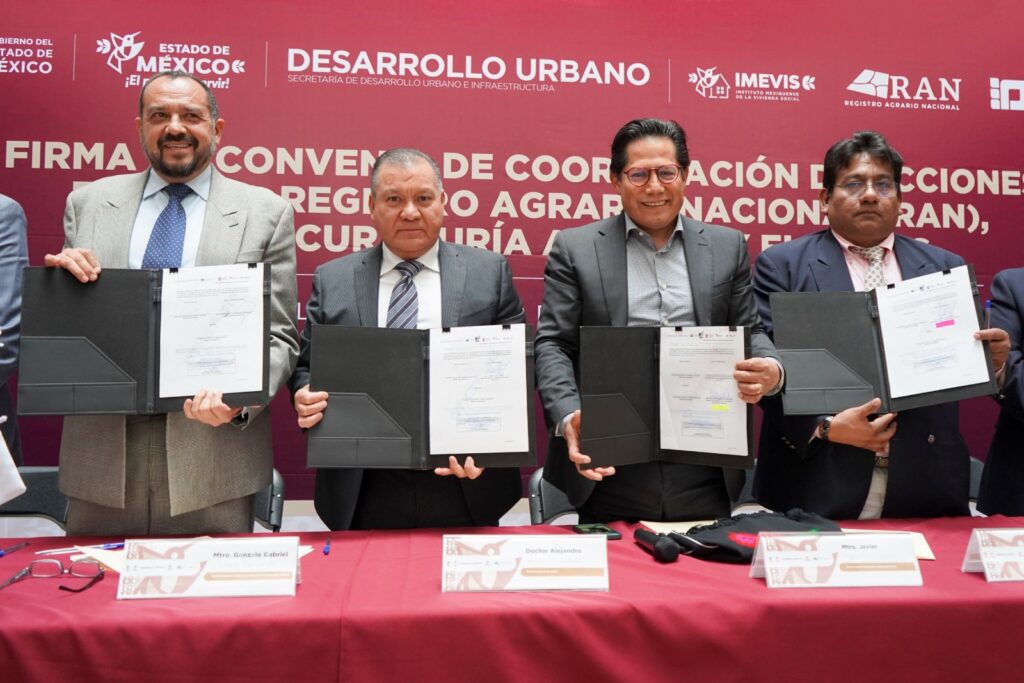 Le doy a conocer que este fin de semana el Gobierno del Estado de México, a través del Instituto Mexiquense de la Vivienda Social (Imevis) de Alejandro Tenorio Esquivel, firmó un Convenio de Coordinación y Colaboración con el Registro Agrario Nacional (RAN) y la Procuraduría Agraria, con el propósito de fortalecer las acciones de regularización del suelo y de la tenencia de la tierra en la entidad.