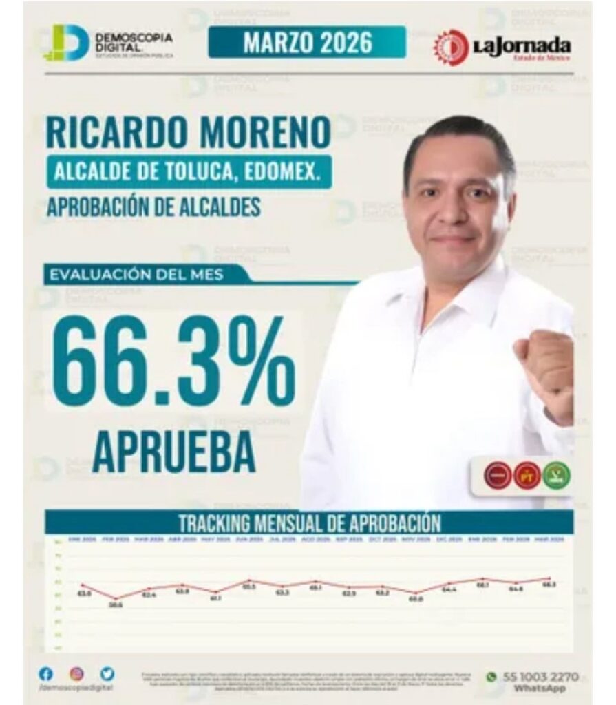 Observamos lector que la acción de Gobierno desde el inicio de su gestión, Ricardo Moreno Presidente municipal de Toluca la realiza de manera eficaz sobre todo de manera transparente. Observamos lector que este su estilo de trabajo así se lo reconoce la ciudadanía: El presidente municipal de Toluca, Ricardo Moreno Bastida, se colocó entre los alcaldes mejor evaluados del Estado de México, al ubicarse en la cuarta posición estatal del más reciente ranking de aprobación de alcaldes correspondiente a marzo de 2026, elaborado por Demoscopia Digital.